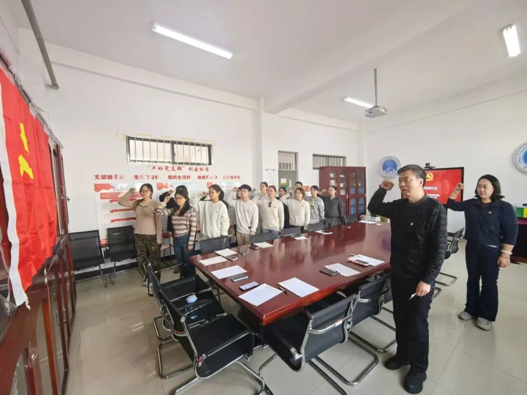 杨庆带领新发展党员面向党旗整齐肃立,庄严宣誓。全体党员高举右拳,目光坚定,铮铮誓言响彻全场,彰显了新时代青年党员的忠诚与担当。